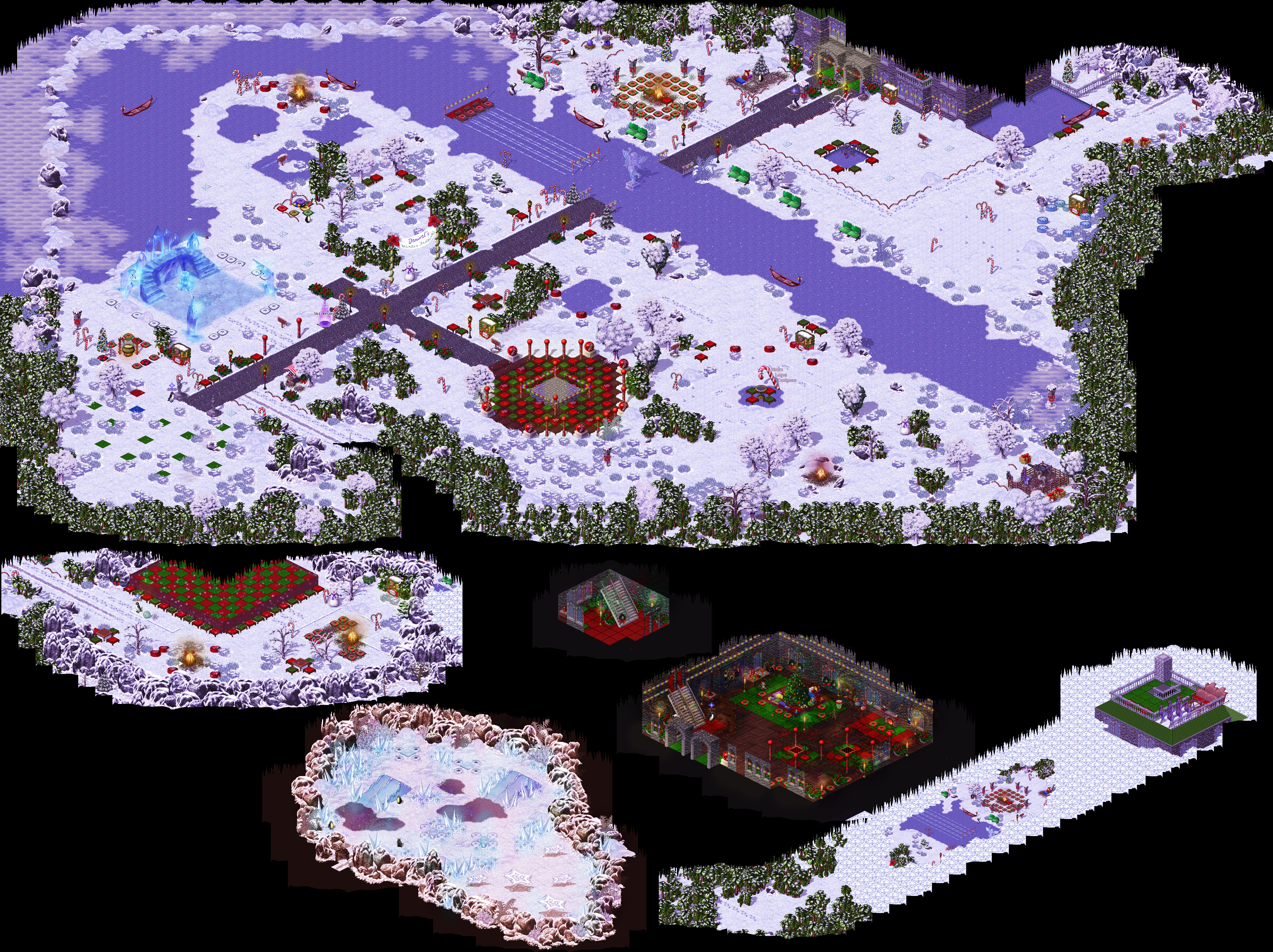 Southwest from the center is Danival's Ice Palace, the Dream Contest Entries area, and the portal to the Ski Resort. Southeast from the Dream Contest Entries is the Winter Arena minigame.